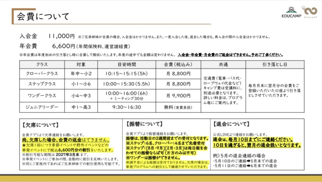 | ジュニアリーダー | 中1~高3 | 日曜 | 12回 | 10:00~16:00 | スタッフ目線で活動に参加しよう |